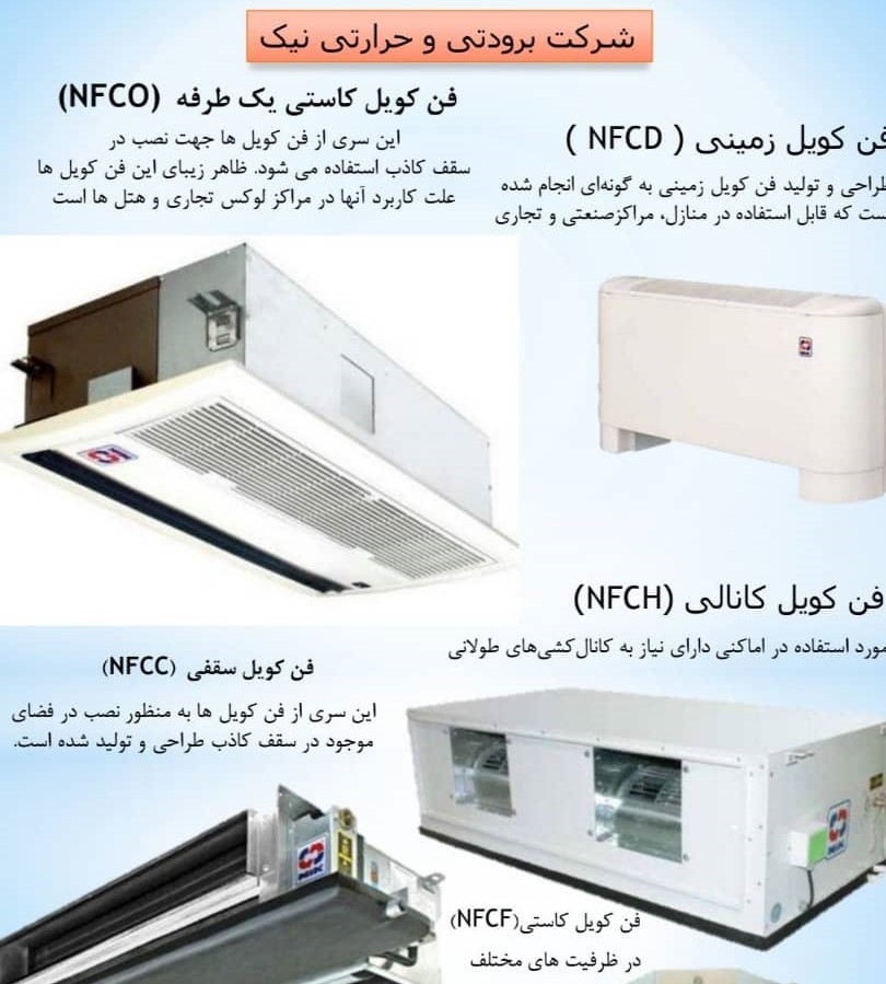 فن کویل های زمینی/کانالی/سقفی/یک طرفه و چهار طرفه با کمپرسور های مطرح موجود میباشد